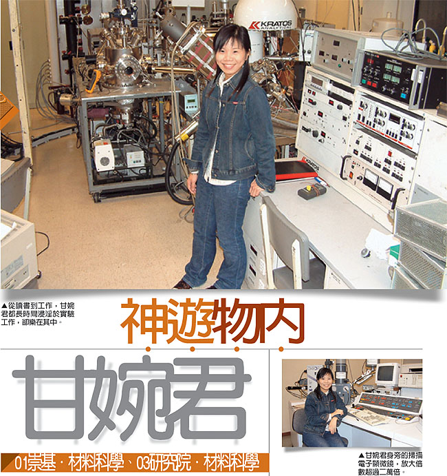 錯誤中前進 材料科學屬於注重實證的物理學分支,長時間在實驗室工作,並操作大型的顯像儀器。物理學家分理論和實證,愛因斯坦就屬於前者,向壁虛構,自圓其說。甘婉君說,物理學家既有天馬行空的怪傑,亦有孜孜不倦的實證主義,兩者殊途同歸,她不認為實驗枯燥。「人人都應學習從刻板的工作中尋找趣味,但先決條件是你必須有興趣。」