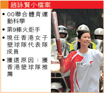 趙詠賢是本港壁球名將,國際賽事屢獲佳績,體壇上發光發亮。獲悉當選火炬手後,心情相當興奮。她以運動員身分,參與傳送奧運火炬的盛事,更添意義。