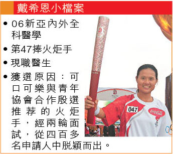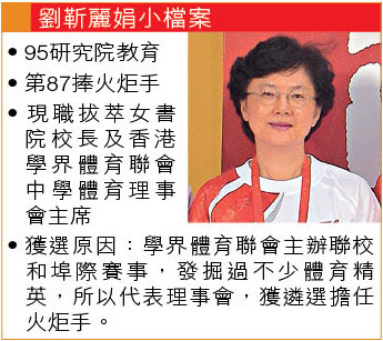 四月底,劉靳麗娟才接獲奧組委通知。學校體育老師上網,找到火炬詳細資料,找來一根相約重量的棒球棍給她。「名單未公布前,看著我練跑的人,都覺得有點奇怪。」