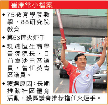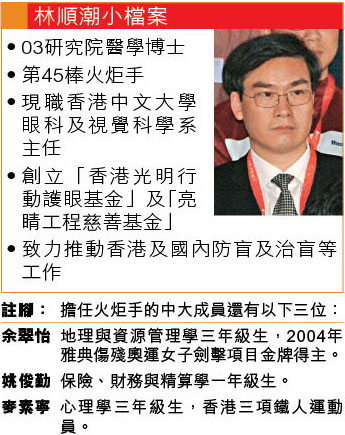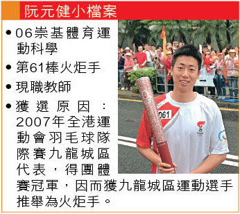 「未入中大前,曾經加入香港青年軍,代表香港打羽毛球賽事,曾想過全職當運動員,後來終於選擇入大學。我深明奧運會,是運動員終生奮鬥的目標,意義重大。能作為火炬手參與,也算是緣份。」