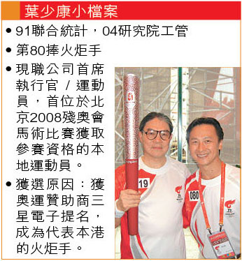 葉少康是本港首位取得傷殘奧運馬術比賽參賽資格,目前在英國受訓三個月,積極備戰八月北京奧運會。他獲奧運贊助商三星電子提名,成為代表本港的火炬手。由於葉少康以騎馬方式,在沙田馬場賽道傳送火炬,故此事前訓練,須習慣以單手持火炬,另一手執轡。